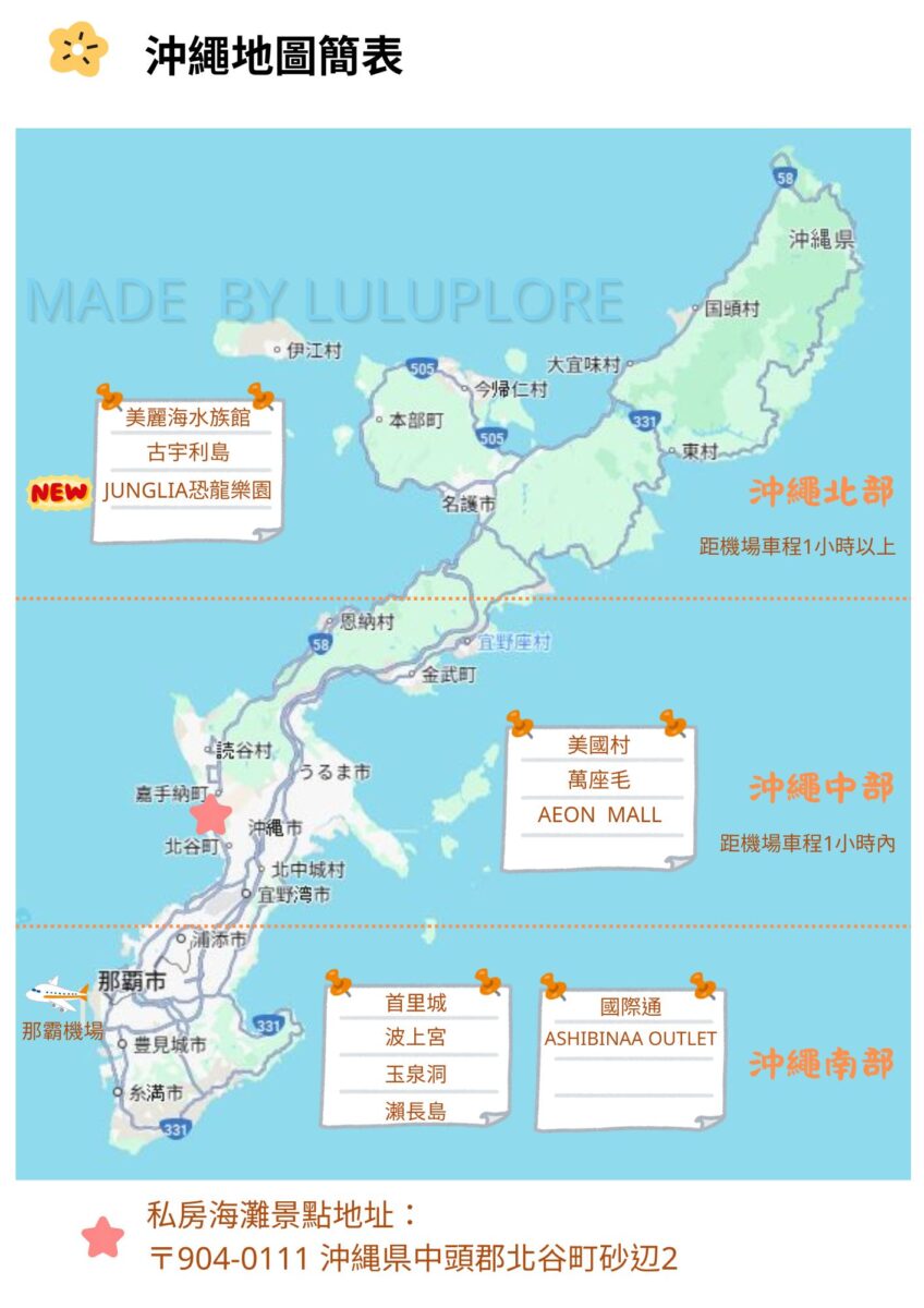 主要景點:北部的美麗海水族館、中部的美國村跟AEON MALL、那霸的瀨長島跟ASHIBINAA Outlet